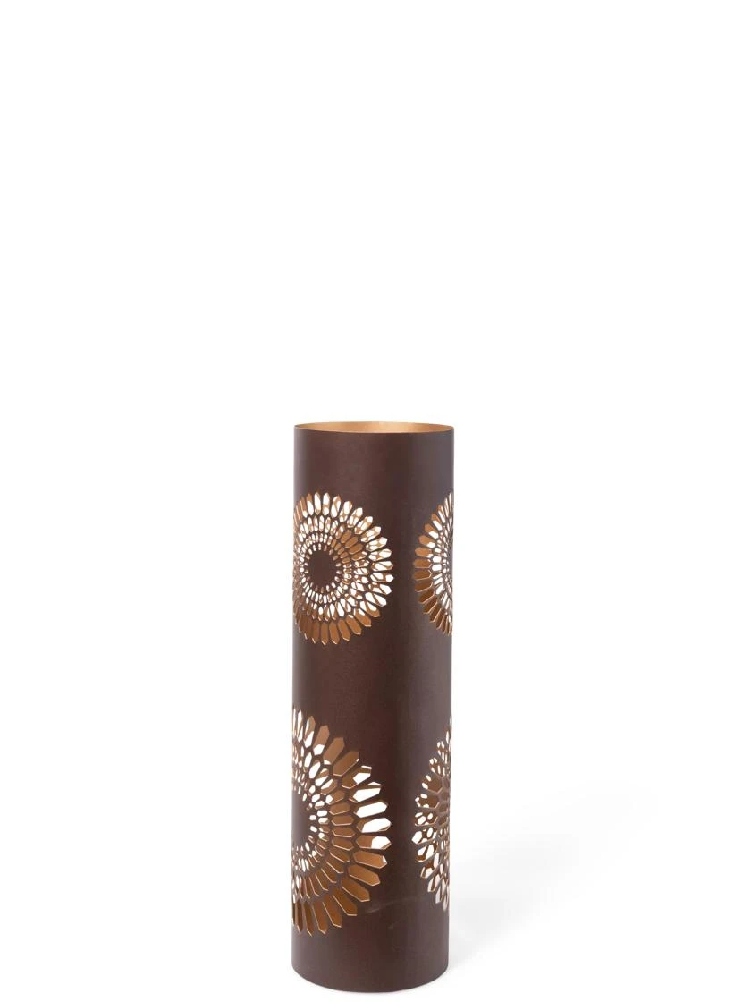 Add some ambiance to your after-dark garden with this trio of lanterns. The beautiful dahlia cutout design casts an intricate pattern on your table or patio. The muted copper-like exterior has a shiny, metallic interior that amplifies the shimmer. Available in three heights.