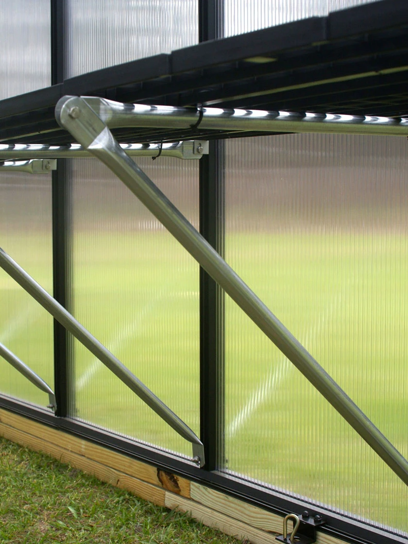 The Monticello 12 foot Work Station Kit is specifically designed for the Monticello line of 12FT greenhouses. The design is simple, unique and thoughtful. The Work Station can be installed either during initial construction or at a later time. The Kit Includes a full 12 ft run (24” deep) for use on either side of the Monticello greenhouse. Since the installation of the support bars uses the inside bolt tracks the shelving could be set at any height within the greenhouse (up to 4ft off the ground). The sturdy vented shelving units on the Work Station are constructed from commercial grade high impact PVC. The vents allow water and air to circulate as well as allowing sunlight to reach underneath the Work Bench. The angle support design allows for free flowing movement without concern for support legs to trip over when working at the workbench. Just like our greenhouses, the Monticello Work Station Kit is proudly made in the USA from start to finish.
