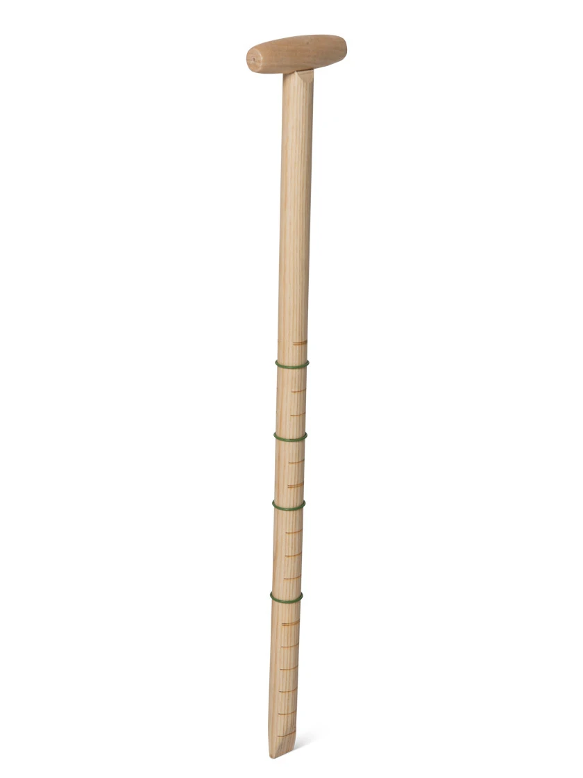 This oversized dibber has “wicked smaht” design! Etched-on inch measurments along the length of the tool let you precisely measure the depth of seed and bulb planting holes. For even quicker depth measurement, slide one of the four green rubber gaskets down to any marking and you’ll have a quick visual aid — no counting or double-checking necessary! Turn it sideways to space plants appropriately and you can even use the chisel tip to score straight rows in the soil. Made of sturdy but lightweight ash wood, it’s also strong enough to break up hard-packed clumps of soil and the ergonomic T-handle helps you avoid wrist fatigue.
